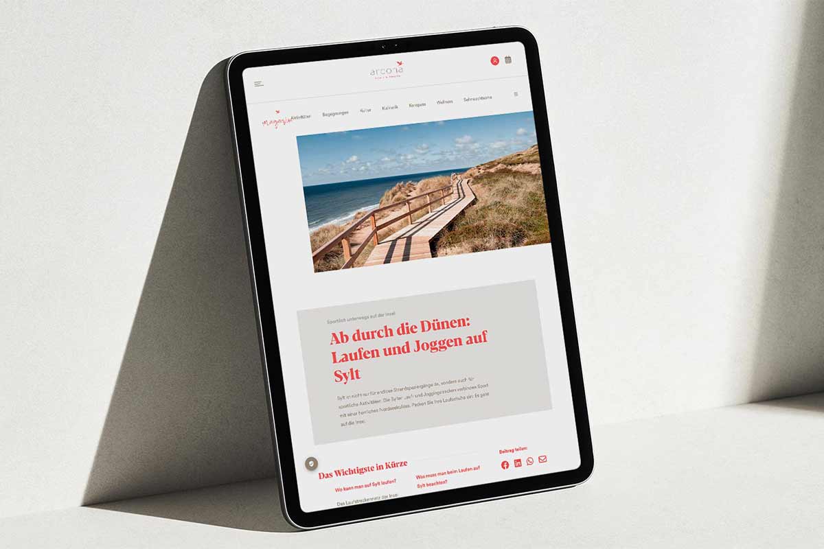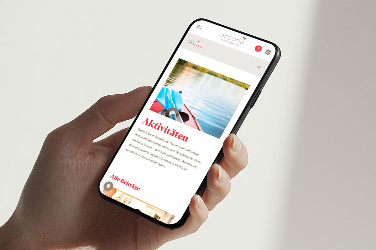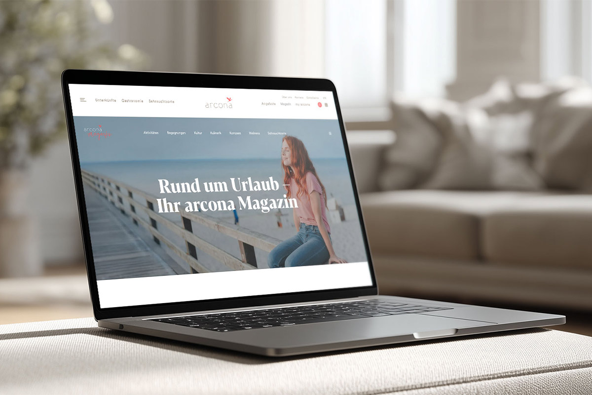 Im Zentrum der Lösung steht das auf Contao 5 basierende arcona Magazin, das als strategischer Content-Hub fungiert. Wir implementierten ein Design, das auf maximale Lesbarkeit und emotionale Bildsprache setzt, um die „Sehnsuchtsorte“ der Gruppe erlebbar zu machen.