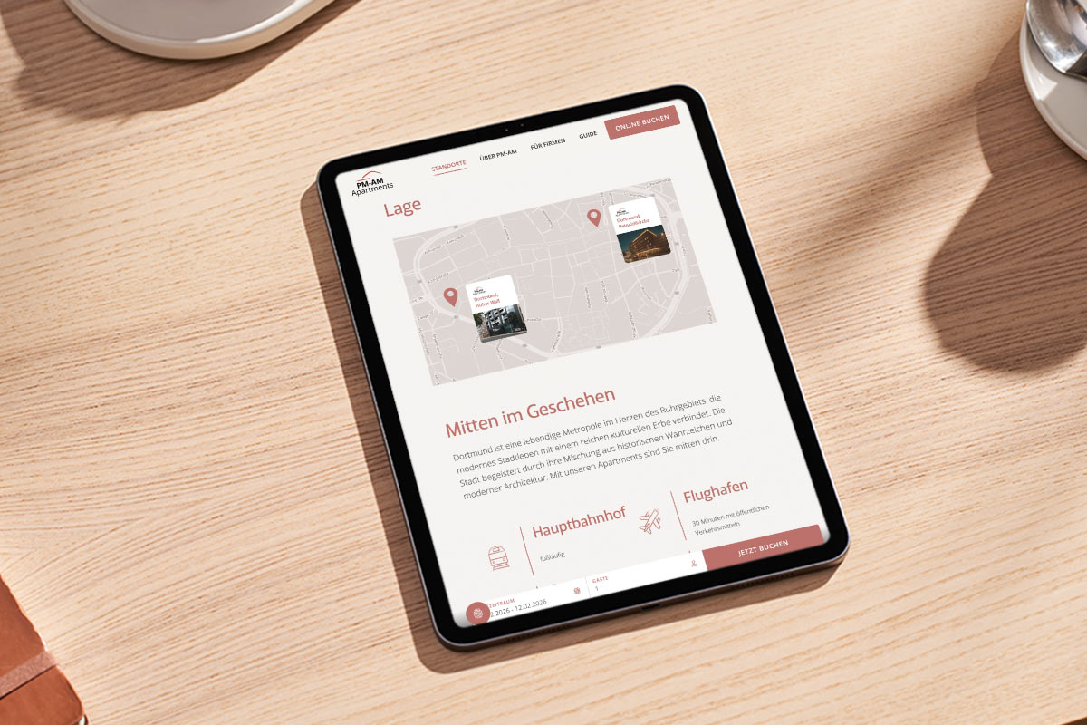 Ein frisches Konzept für Serviced Apartments im Herzen von Dortmund digital zum Leben erwecken. Die Herausforderung bestand darin, eine Marke zu positionieren, die sich im Spannungsfeld zwischen anonymen Hotels und unpersönlichen Kurzzeitmieten behauptet. Es galt, den Markenkern „PM-AM“ – der für den Rhythmus des Lebens von Abend bis Morgen steht – als modernes Lifestyle-Versprechen für „Wohnen auf Zeit“ zu etablieren. Ziel war ein Portal, das Designanspruch, volle Flexibilität und professionellen Hotelservice unter einem Dach vereint.